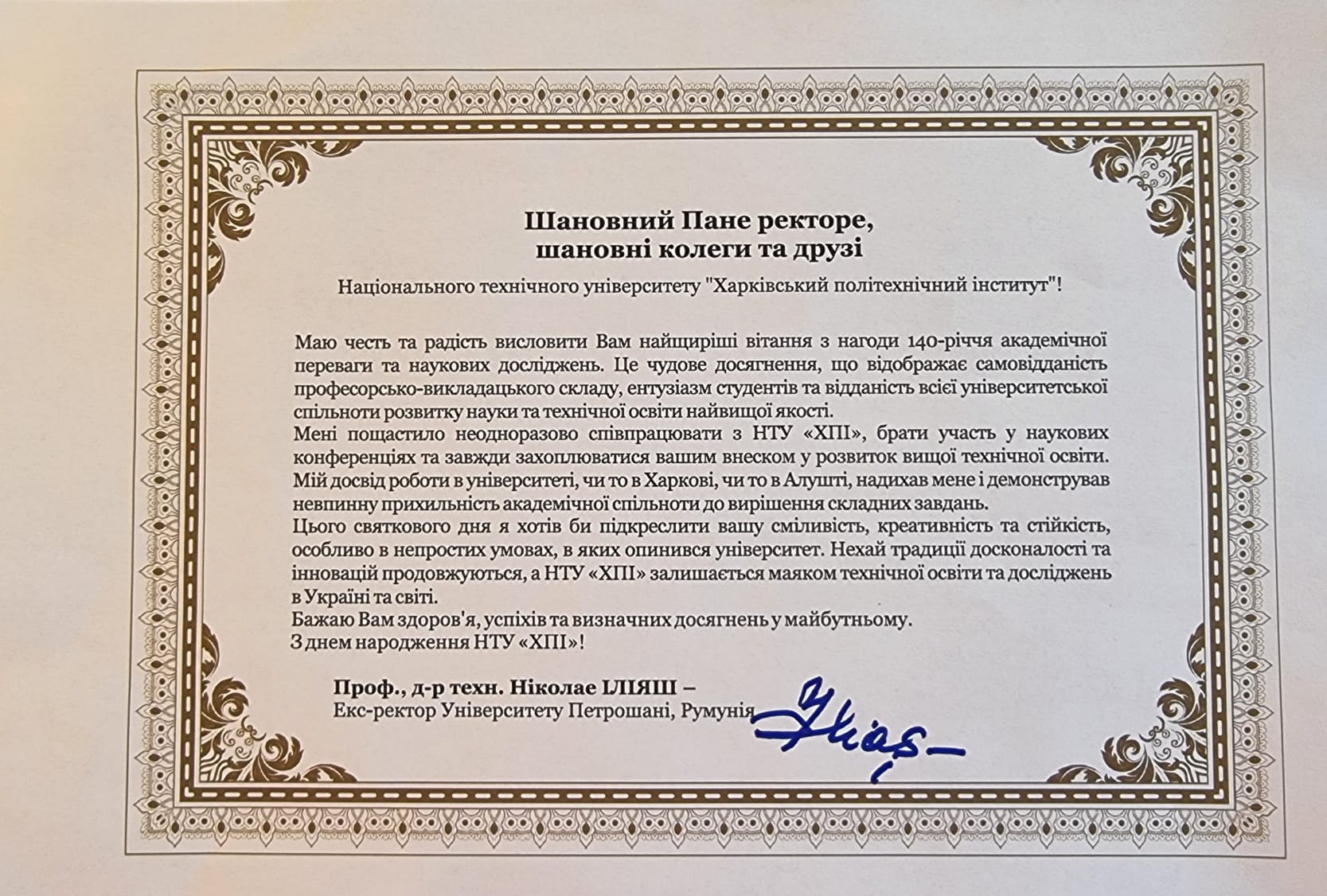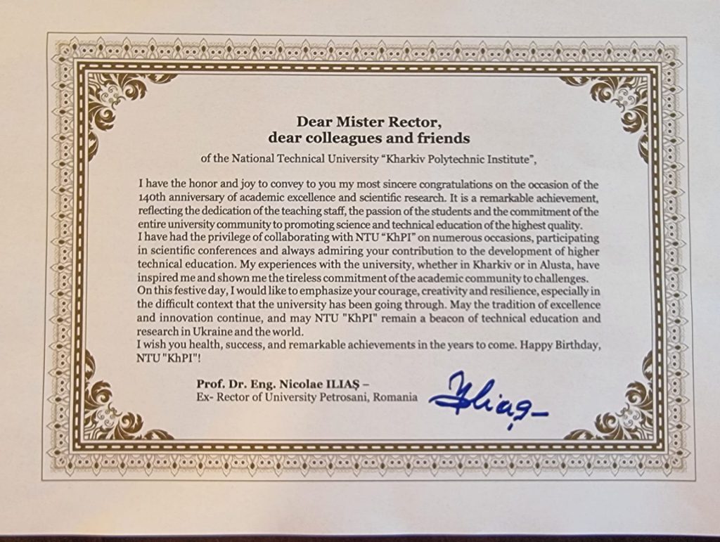 Thus, NTU «KhPI» received greeting cards on its 140th anniversary from:
