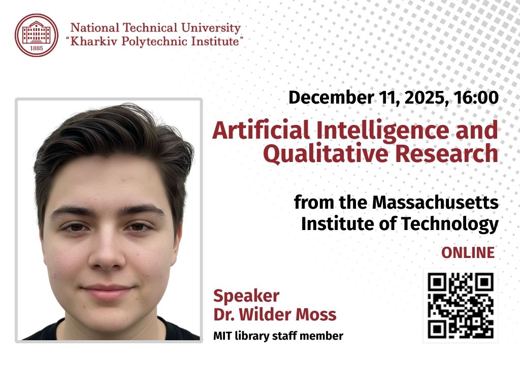 NTU «KhPI» invites students, teachers, researchers, and library staff to join the lecture «Artificial Intelligence and Qualitative Research: How MIT Researchers Actually Use Artificial Intelligence and What It Means for You». It will take place on December 11 from 4:00 p.m. to 5:00 p.m. online on the Zoom platform. Participants who register will receive an automatic invitation in their calendar. Language: English. Speaker: Dr. Wilder Moss, Massachusetts Institute of Technology (MIT) Library Staff Member. Registration is not required: https://luma.com/src35edd. Link to connect: https://mit.zoom.us/j/98095528523?pwd=q9YJaiUKa3PZvxUKeUgfJIpgFx2ao7.1 Meeting ID: 98095528523, Password: z-3036.