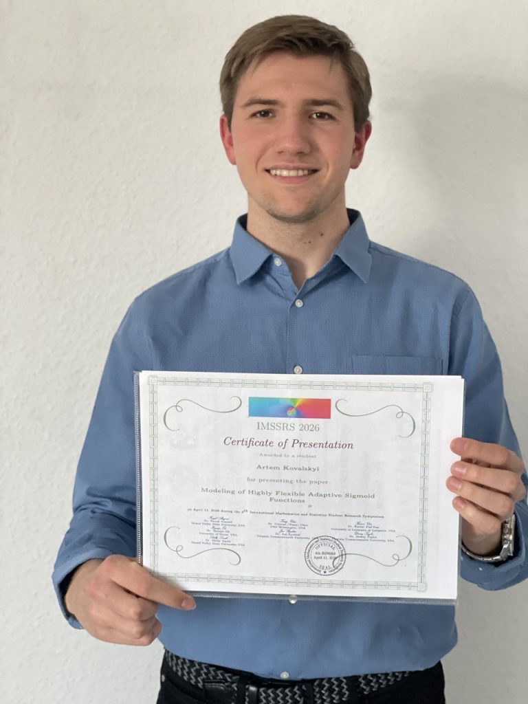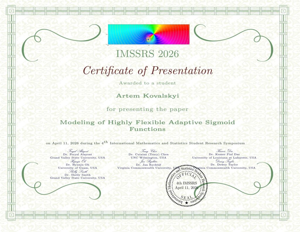 Artem Kovalskyi is a student at the Educational and Scientific Institute of Mechanical Engineering and Transport at the National Technical University «Kharkiv Polytechnic Institute» (NTU «KhPI»). In his presentation at the 4th International Scientific Symposium on Student Research in Mathematics and Statistics (4th International Mathematics and Statistics Student Research Symposium – IMSSRS) he presented a research paper on «Modeling Highly Flexible Adaptive Sigmoid Functions.» As a result of his presentation, the student from Kharkiv Polytechnic received an international certificate, and the abstract of his report was included in the official conference proceedings. The program of the international symposium in the United States included more than 70 presentations selected by an international organizing committee, which included leading researchers from U.S. universities (Grand Valley State University, UNC Wilmington, University of Louisiana at Lafayette, University of Guam, Virginia Commonwealth University). Information about the symposium was published in the official calendar of the Mathematical Association of America (MAA), confirming its high scientific status and international recognition. The conference was held with the support of leading mathematics departments at U.S. universities—Grand Valley State University, Virginia Commonwealth University – and the African Mathematical Union (AMU).