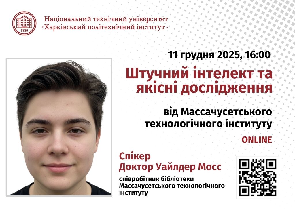 Для студентів, викладачів, науковців та працівників бібліотек НТУ «ХПІ» пропонує долучитися до лекції «Штучний інтелект та якісні дослідження: як дослідники MIT фактично використовують штучний інтелект і що це означає для вас». Вона відбудеться 11 грудня з 16:00 до 17:00 в онлайн-режимі на платформі Zoom. Учасники, які зареєструються, отримають автоматичне запрошення в календарі. Мова: англійська. Спікер – співробітник бібліотеки Массачусетського технологічного інституту (MIT) доктор Уайлдер Мосс. Реєстрація не є обов’язковою: https://luma.com/src35edd. Посилання на підключення: https://mit.zoom.us/j/98095528523?pwd=q9YJaiUKa3PZvxUKeUgfJIpgFx2ao7.1 Ідентифікатор: 98095528523, Код доступу: z-3036.