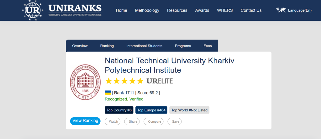 Національний технічний університет «ХПІ» увійшов до десятки найкращих закладів вищої освіти України (6-те місце) та до топ-500 університетів Європи (464-та позиція) за глобальним міжнародним рейтингом UniRanks 2026. Дослідження орієнтоване на інтереси студентів і охоплює один із найширших переліків критеріїв серед існуючих рейтингів. Його основні показники: добробут здобувачів, успішність випускників, міжнародні партнерства та рівень розвитку цифрової інфраструктури. Оцінювання базується на системі Open-Rank, що дозволяє експертам та представникам індустрії брати участь у визначенні ваги показників. Це забезпечує прозорість і відповідність рейтингу реальним потребам сучасного ринку праці. Загалом у UniRanks 2026 брали участь 237 університетів України та майже 15 000 університетів світу. Регіональні українські лідери: Харків, Київ, Львів, Суми.